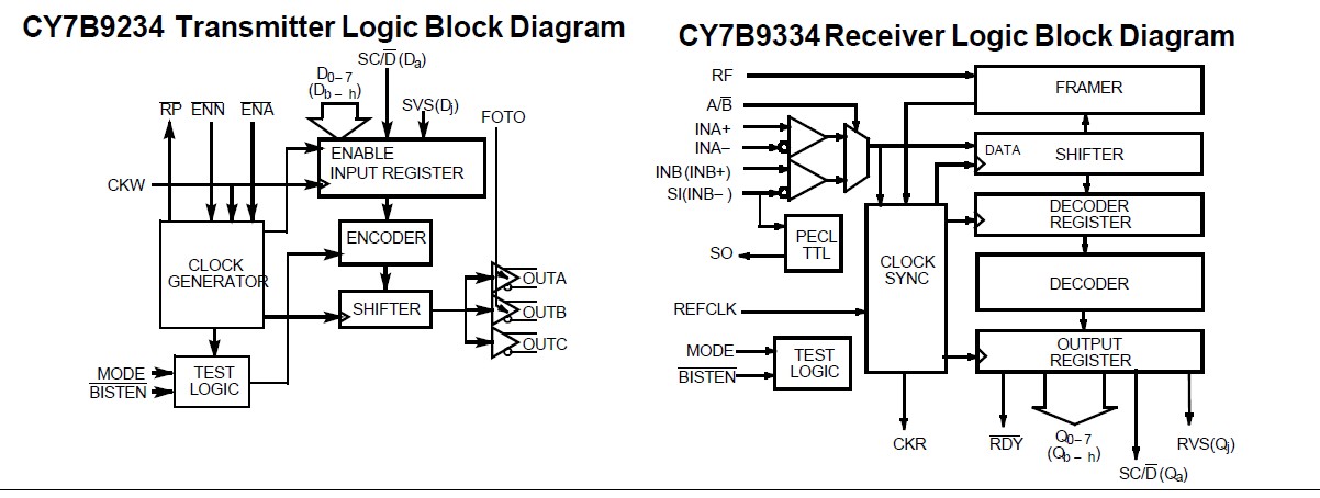 CY7B9234-400JC features: (1)Fibre Channel compliant; (2)DVB-ASI compliant; (3)RX PLL tolerant of long run length data patterns (>20 bits); (4)8B/10B-coded or 10-bit unencoded; (5)TTL synchronous I/O; (6)No external PLL components; (7)Triple PECL 100K serial outputs; (8)Dual PECL 100K serial inputs; (9)Low power: 350 mW (Tx), 650 mW (Rx); (10)Compatible with fiber-optic modules, coaxial cable, and twisted pair media; (11)Built-In Self-Test; (12)Single +5V supply; (13)28-pin PLCC.