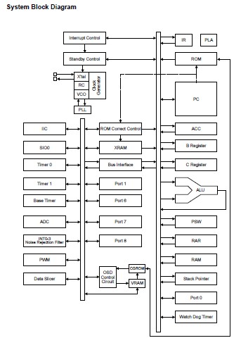 LC863240C features: (1)CPU: Operable at a minimum bus cycle time of 0.424μs; (2)On-chip RAM capacity: 640/512 bytes; (3)OSD RAM: 352 bits; (4)Closed-Caption TV controller and the on-screen display controller; (5)Closed-Caption data slicer; (6)Four channels x 8-bit AD Converter; (7)Three channels x 7-bit PWM; (8)Two 16-bit timer/counters, 14-bit base timer; (9)8-bit synchronous serial interface circuit; (10)IIC-bus compliant serial interface circuit (Multi-master type); (11)ROM correction function; (12)16-source 10-vectored interrupt system.